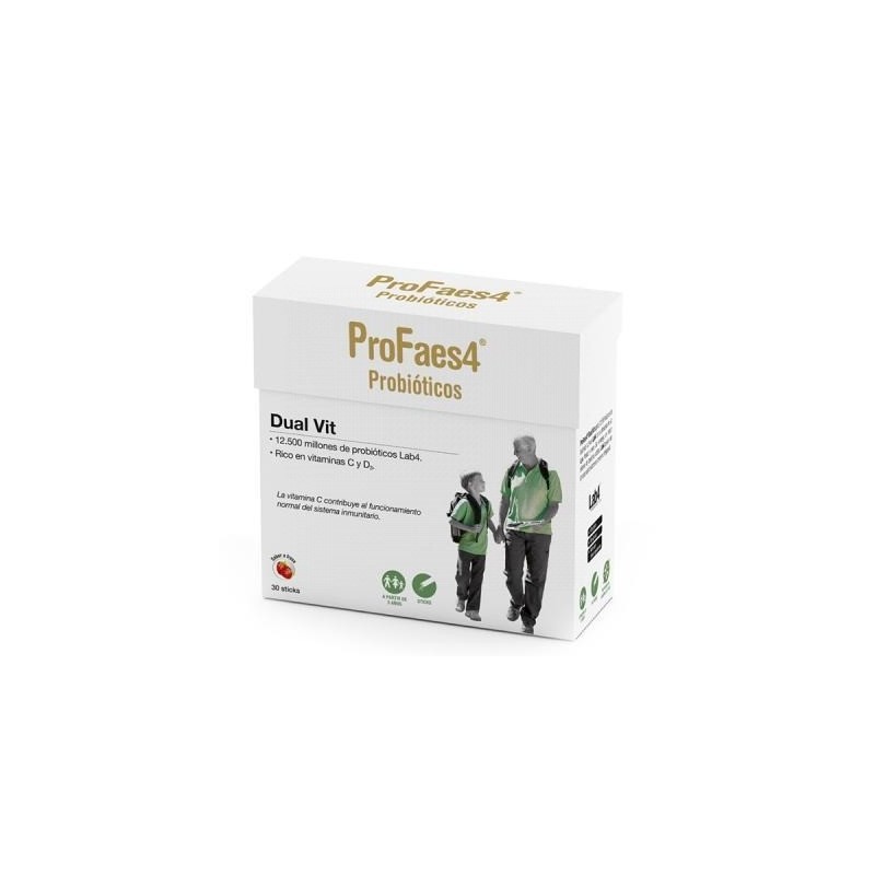 Los Fructooligosacáridos (prebióticos) aumentan el número de Bifidobacterias en el colon, además Profaes4 Dual-Vit, está compuesto con 12.500 millones de prebióticos Lab4, 50 mg de Vitamina C2 y Vitamina D3 que contribuyen al funcionamiento normal del sistema inmunitario. Es apto para adultos y niños a partir de 3 años.