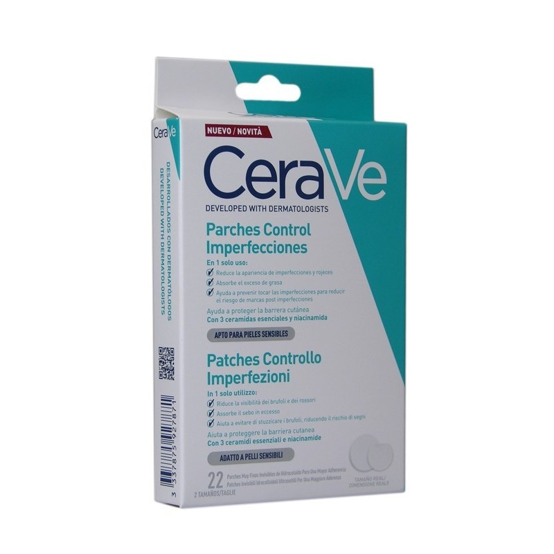 Estos parches de hidrocoloide tienen un grosor de solo 300µm, lo que los hace invisibles en todos los tonos de piel. Además, pueden usarse bajo maquillaje y no se despegan. Vienen en 2 tamaños, 12 mm y 10 mm, para adaptarse al tamaño de los granos. Son aptos para piel sensible, hipoalergénicos, no comedogénicos y aptos a partir de 13 años. El 94%*** de los consumidores coincide en que el parche se retira fácilmente, y el 85%**** en que la piel se ve calmada tras retirarlo por la mañana. Con cerave, ceramidas dentro, grano fuera.